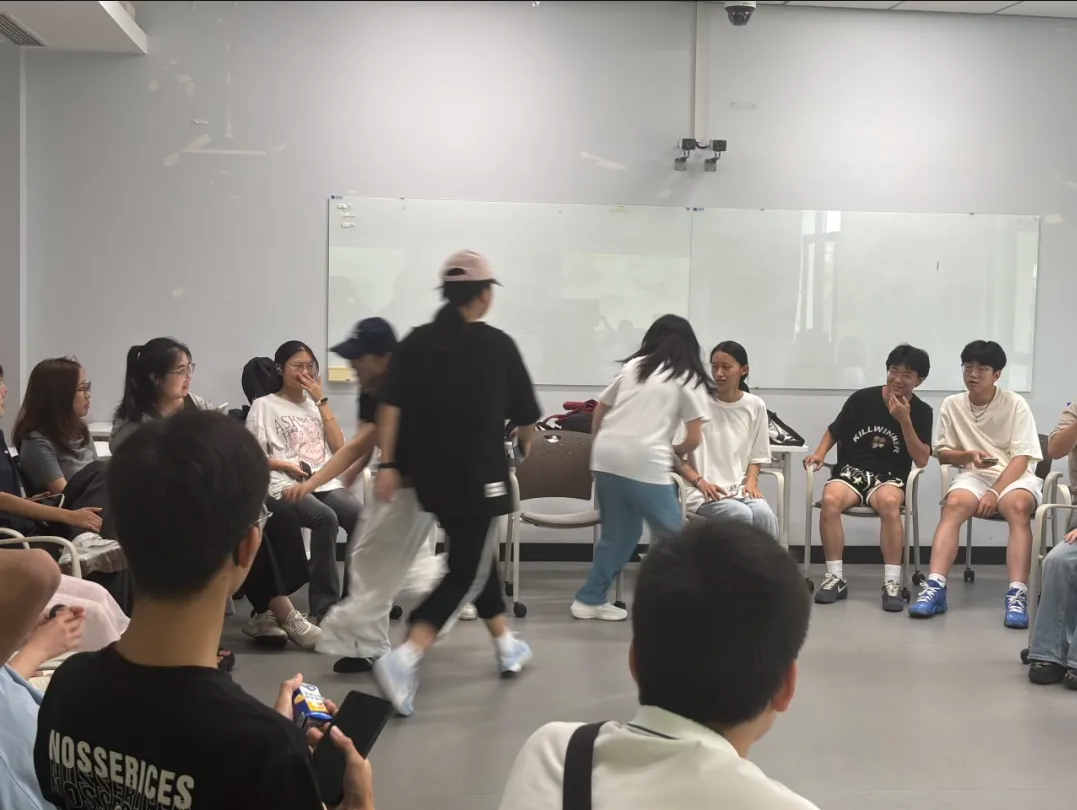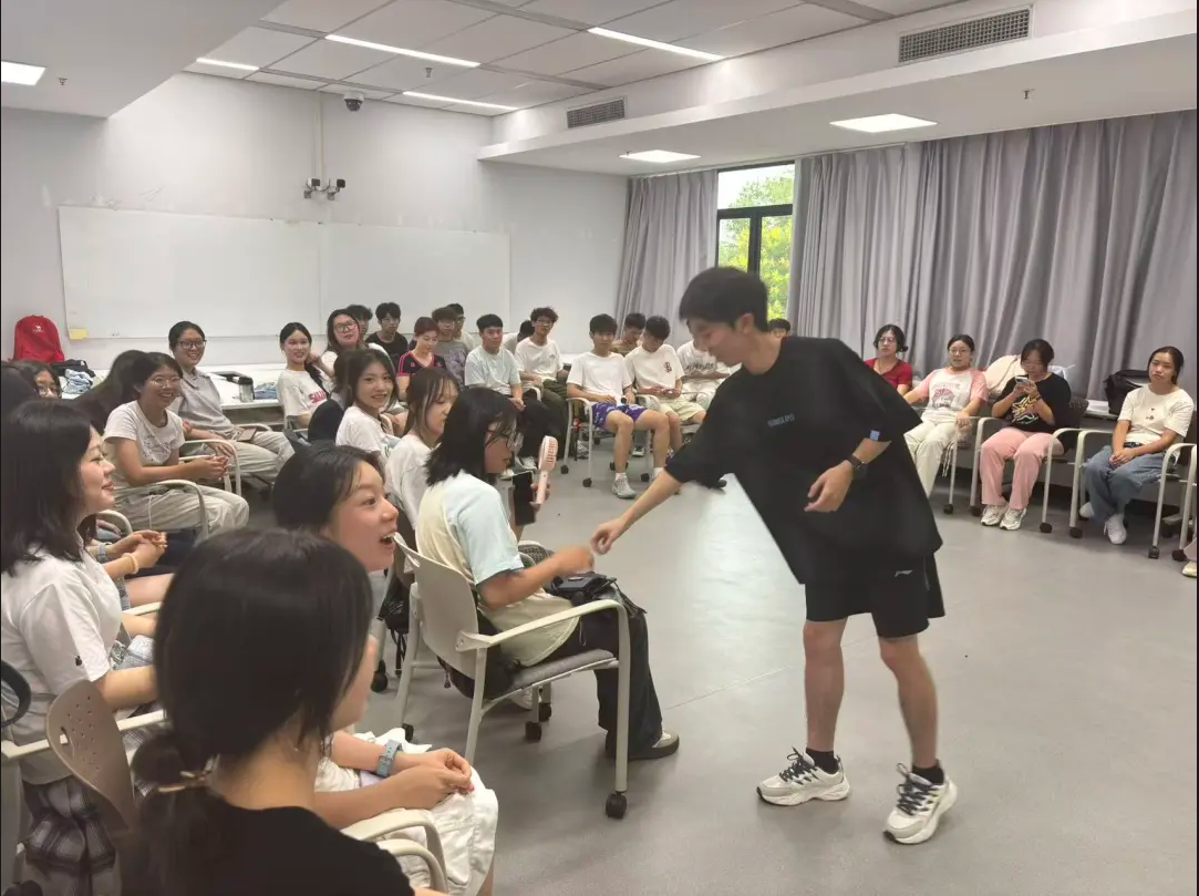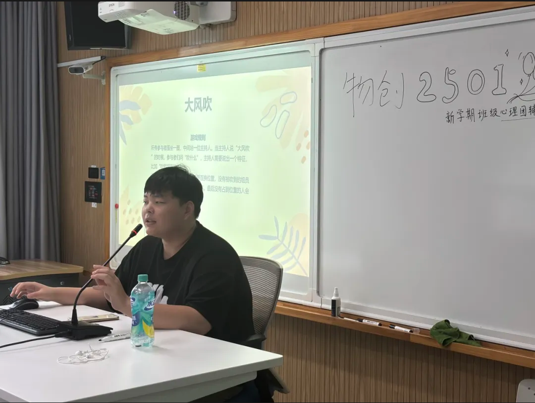 在主持人的引导下,物创2501班的同学们体验了“大风吹”的活动。“大风吹”如同一场轻松的人际特征扫描,当“吹所有戴眼镜的同学”这样的指令发出,大家在欢笑跑动中瞬间意识到自己与同伴的共通点,破除了初见的薄冰。