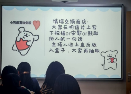 在热烈的猜词游戏之后,进入了安静而温暖的“情绪交换商店”游戏。每位同学会拿到一张空白明信片,邀请大家匿名写下自己入学以来的感受或是想对班级同学说的话又或是一份简单的祝福,最后明信片被统一收集起来,再由同学们随机抽取一张他人的明信片进行阅读。许多同学表示,这个环节让他们感受到了集体的温暖与理解,意识到了情绪的共鸣,也收到了来自同学的善意,极大地增强了班级的归属感。