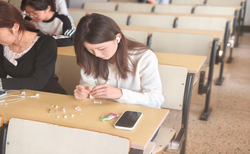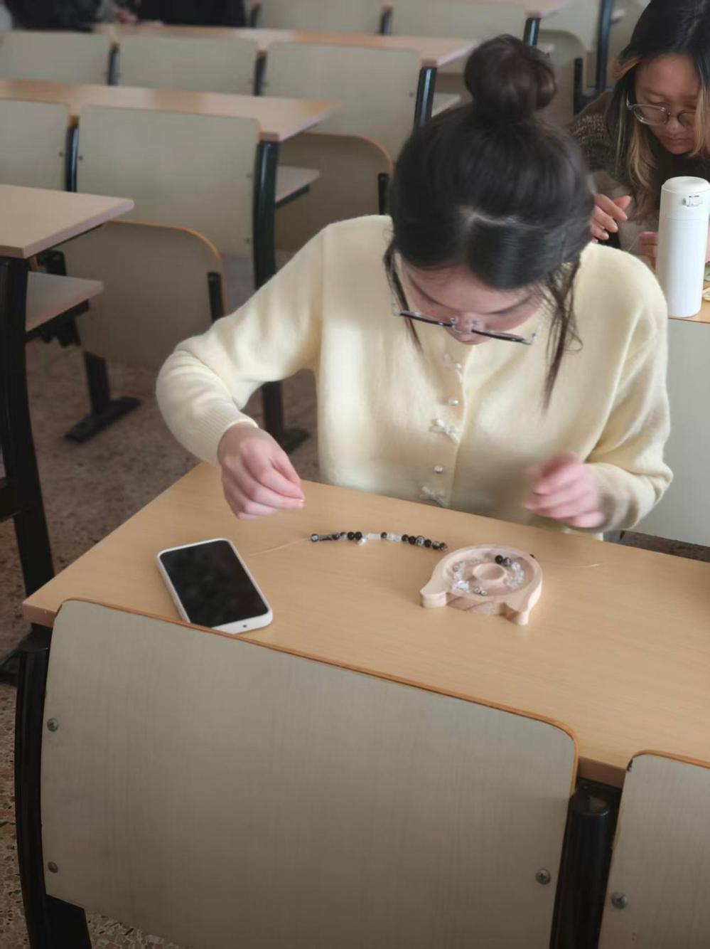 室内,暖光漫撒桌面,串珠在掌心流转成诗。各色琉璃、木珠、玛瑙静静陈列,随心意挑选搭配,穿绳、打结、调整间距,每一个动作都藏着专注与巧思。在这里,无需繁复技巧,不必拘谨羞涩,只需静下心来,将一颗颗珠子串联,在穿绳、搭配的指尖流转中,舒缓初入校园的焦虑,在专注创作中陶冶情操、释放压力。每一次穿珠的专注,都是与自我的温柔对话;每一款手串的诞生,都是独一无二的心意表达。