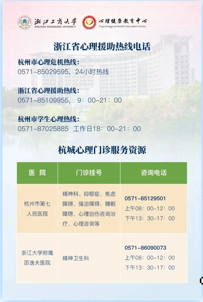 正视内心的困扰,主动寻求帮助,是爱自己的勇敢表现。亲爱的同学,如果你正被心理波动所困扰,请别独自扛着。浙江工商大学心理中心随时为你敞开大门,专业咨询师愿与你一同面对,陪你走出低谷。
