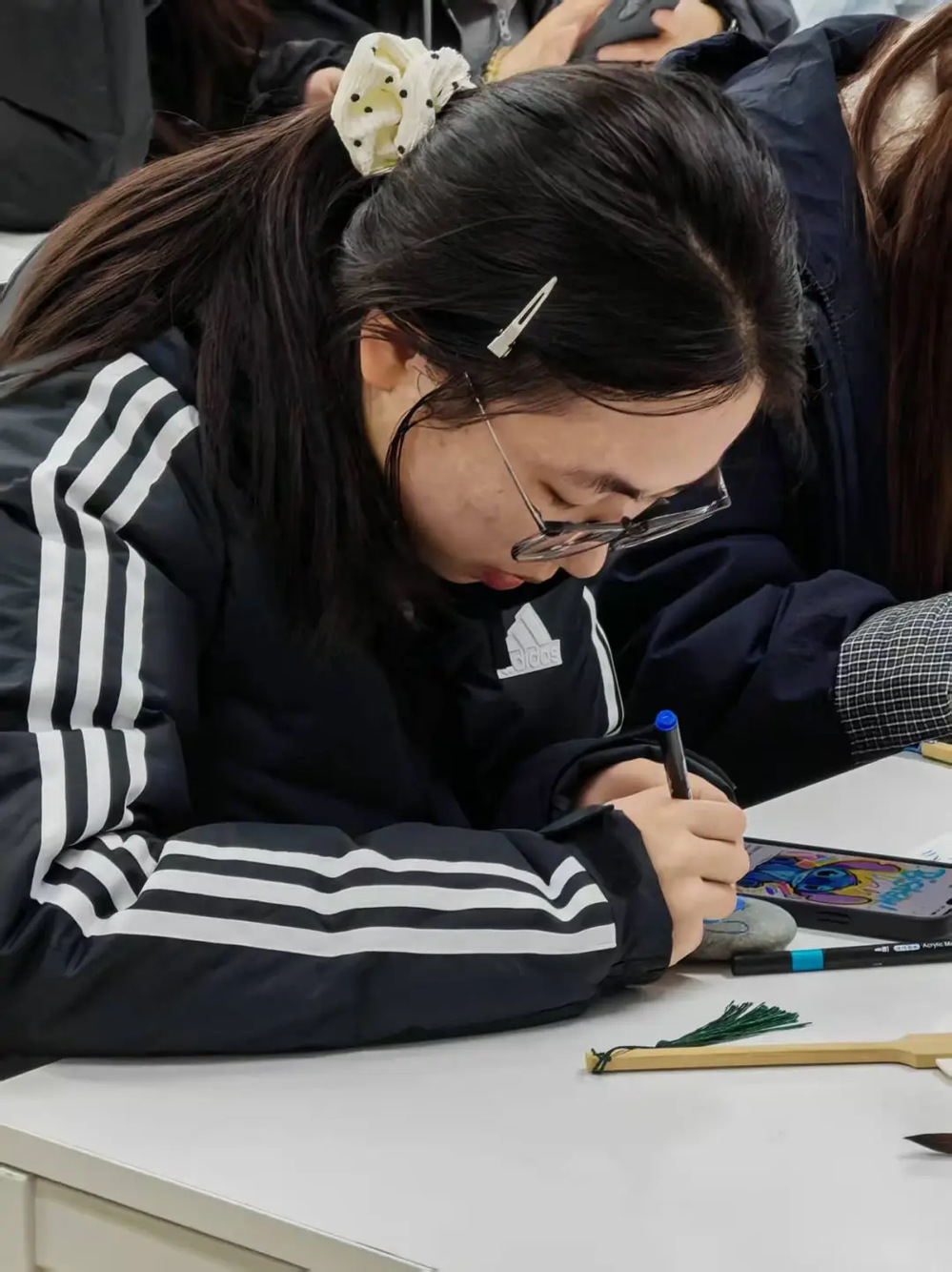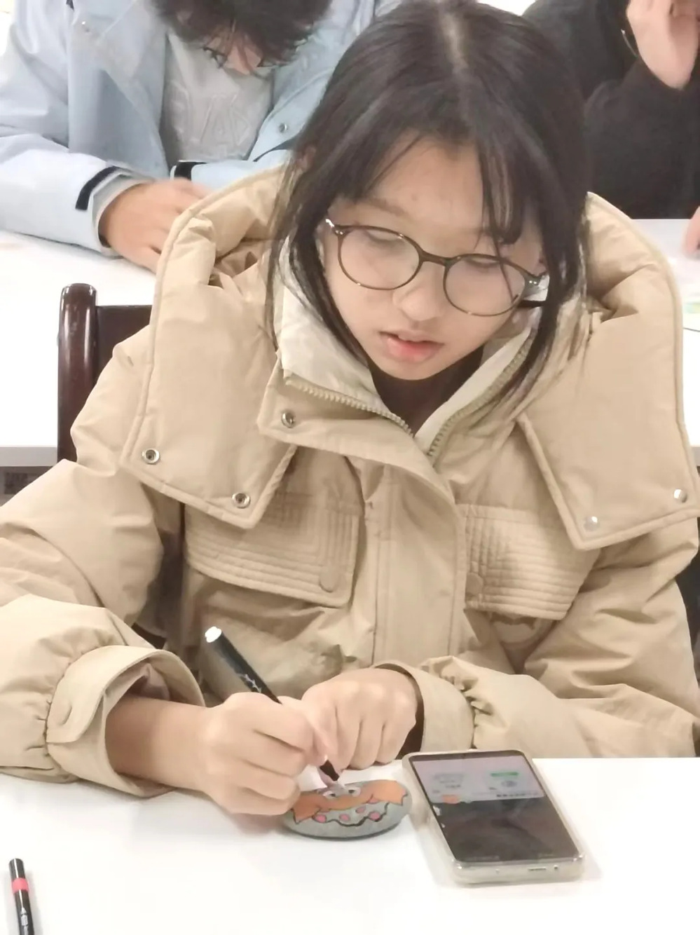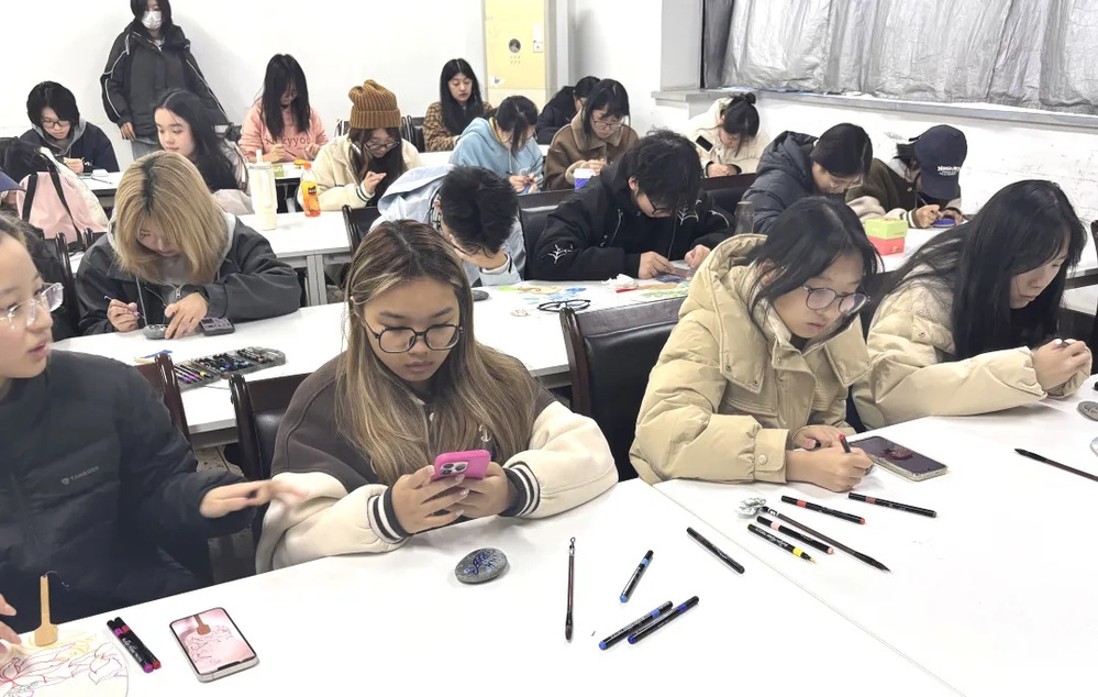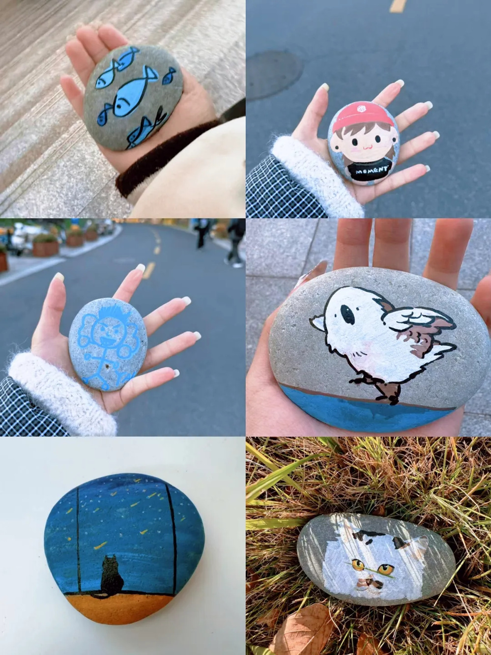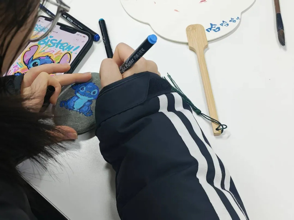 每个人都沉浸在自己的小世界里。有人笔锋轻快,寥寥几笔就让卡通小熊的圆耳朵立在石上;有人细致描摹,将校园的梧桐叶纹路精准复刻;还有同学互相分享技巧,你帮我调亮底色,我教你勾勒线条,让整个空间都充满了欢声笑语。一块块原本朴素的石头,在大家的巧手下,渐渐被注入了鲜活的温度与独特的心意、