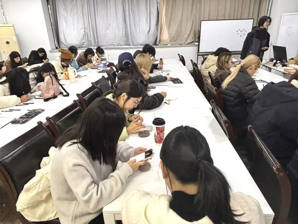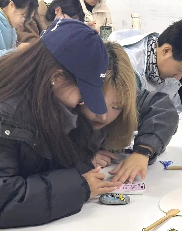 活动现场,同学们围坐在一起,手中捧着形态各异的鹅卵石。有的轻轻摩挲石面感受纹理,有的对着草图小声讨论配色,连空气里都飘着期待与创意的气息。