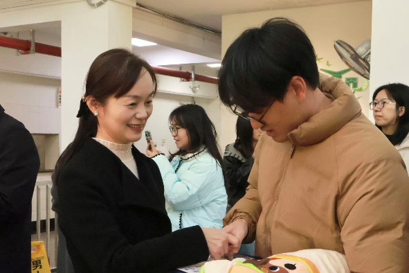 老师们亲手将一件件礼物送到同学们手中,与同学们亲切交流,了解近期的复习进度与生活状况。鲍伟书记一边将牛奶递给学生,一边握着他们的手,反复叮嘱要注意休息,保重身体;与此同时,李蓉书记关切地询问每位同学的情绪状态,并欢迎大家随时找她倾诉;最后,徐宝见书记则特意挑选了红色的毛毯塞到同学们怀中,声音洪亮地送上祝福:“必须用红色的,讨个好彩头,预祝大家旗开得胜!”欢声笑语与殷切鼓励交织,冬日的寒冷被这温馨的场景彻底驱散。