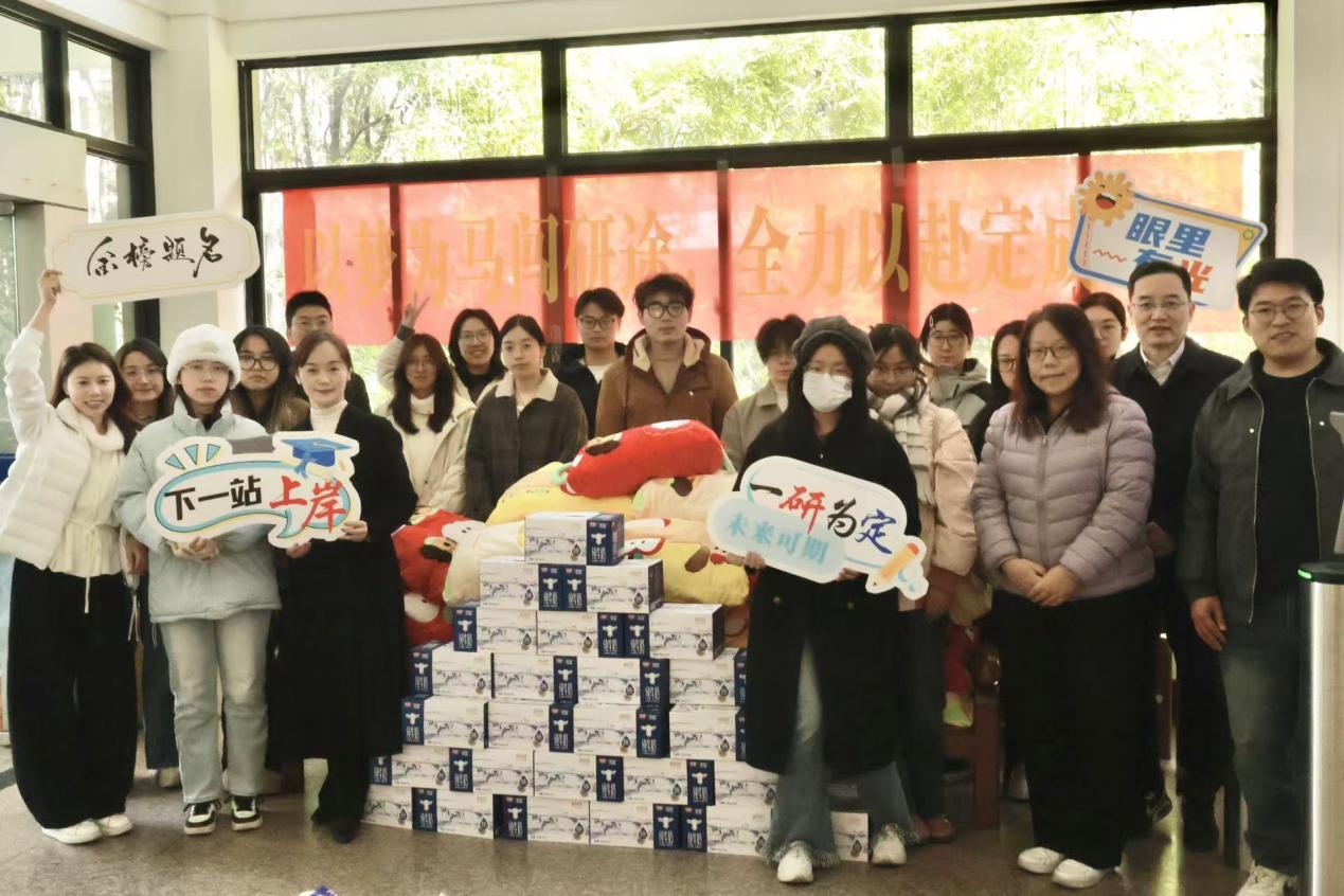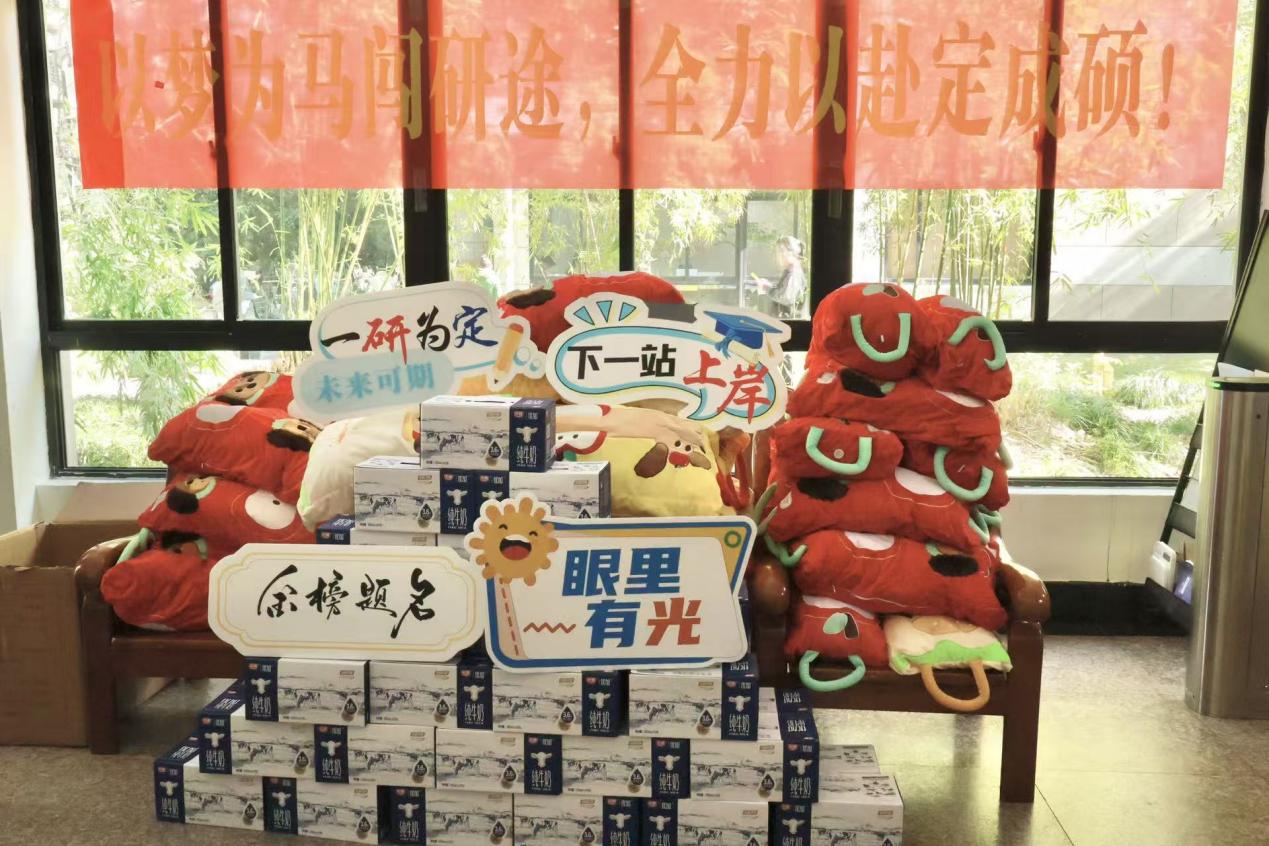 在最后的冲刺阶段,学院为每一位考研学子准备了“考研大礼包”。礼包小巧,却满载着学院的祝福——精致的文具套装,助力学子们笔下生辉,答卷顺利;便携式毛绒毯,为挑灯夜读的同学带来一份温暖;而纯牛奶则象征着健康的重要性,提醒大家在备考的同时,不忘为身体补充必要的营养。不仅如此,现场悬挂的“以梦为马闯研途,全力以赴定成硕”的横幅,道出了学院对同学们最诚挚的期盼。