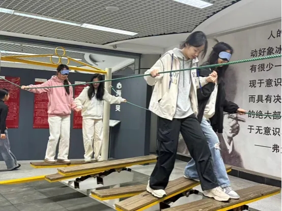 随后进行的“盲行信任走”和“过独木桥”等环节,进一步考验了同学们的信任感与配合度。尤其是在蒙眼状态下依赖同伴指引前行,不少同学表示“虽然有点紧张,但非常安心”。这些活动不仅带来了欢笑,也让同学们学会在合作中信任彼此,在支持中共同成长。
