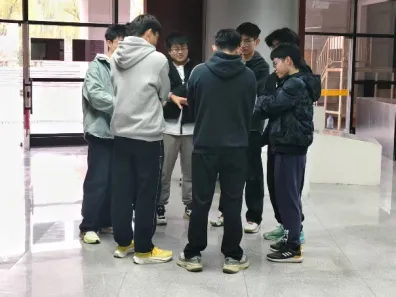 在第二个小游戏中,同学们先围成一个圈,在素拓师的指导下,大家左手叠在右手上,交叉着和两边同学手牵手,大家需要靠自己的智慧,解开手链,回到手拉手围圆圈的状态。经过一系列的尝试以后,同学们陷入了沉思,其中一位同学灵光一动,打破了沉默的局面!最后在同学的协作之下顺利完成了挑战。