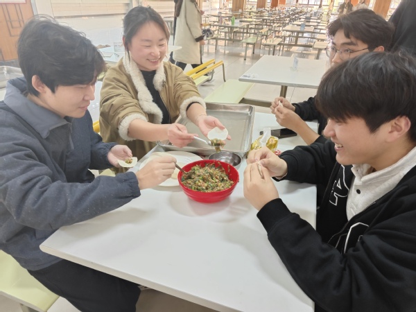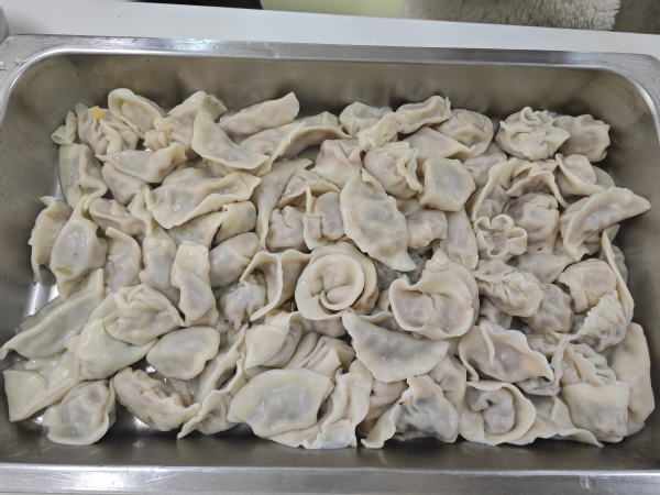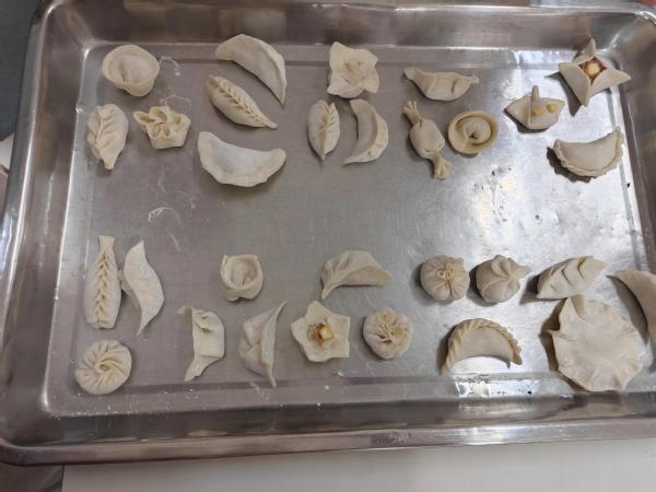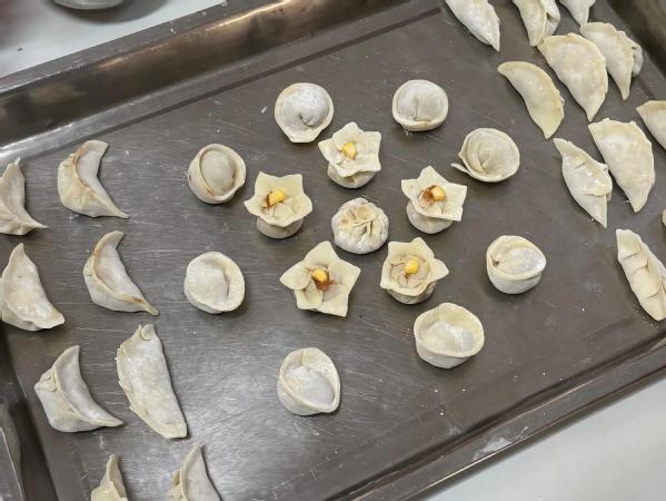 现场气氛热烈温馨,欢声笑语与交流声交织。在动手实践中,大家逐渐找到了节奏,互不熟悉的同学也在互助互动中快速拉近距离。桌上既有传统的月牙形、元宝形饺子,也有创意十足的花边饺、柳叶饺也不断涌现,形态各异却都饱含心意。经验分享与成功包出漂亮饺子的欢呼声在食堂此起彼伏,一个个饺子凝聚的不只是食材,更是同学们的耐心、巧思与对活动的投入。案板上的饺子越堆越多,心里的“隔阂墙” 却越变越薄。当看到自己和同伴包的饺子摆在一起,哪怕形态各异,也会生出一种 “我们共同完成了一件事” 的归属感 —— 这种在协作中产生的心理认同,比任何语言都更能拉近彼此的距离。
