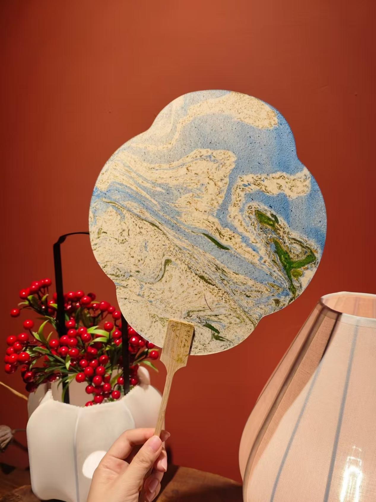 一柄漆扇,不只是摇走酷暑的清凉,更是一场与千年非遗的对话,一次治愈内心的手作修行。中国人用漆的历史绵延八千载,当温润的大漆滴入清浅水面,随性晕开成流云、山峦、晨星的模样,素白扇面轻沉慢提的瞬间,山川日月便被温柔拓印,指尖的动作,也让浮躁的情绪随漆纹慢慢舒展。