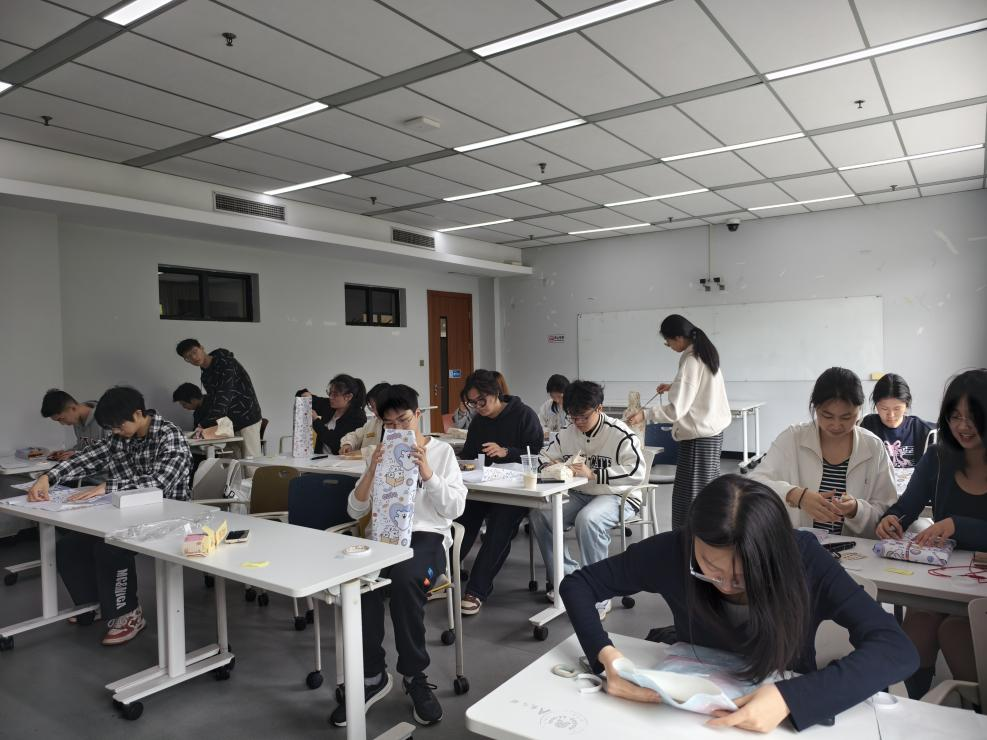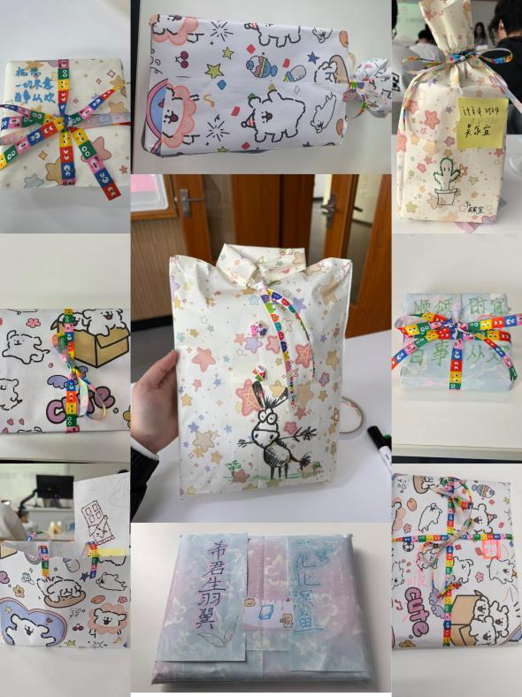 活动现场,同学们围坐桌前,开启最有仪式感的环节,为一位“陌生人”亲手包装礼物。丝带、彩纸、贴纸、画笔,一点点组合成独一无二的心意。有人反复调整蝴蝶结的角度,有人画下可爱的图案,还有人悄悄塞进一张手写便签。那一刻,礼物不再只是物品,它承载了善意、情绪与认真。没有DDL,没有代码报错,只有专注的手和柔软的心。